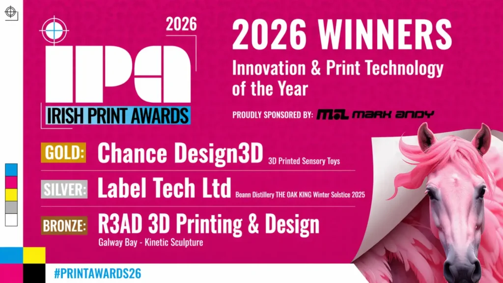The Irish Print Awards 2026 (IPA), held on April 10th at the Clontarf Castle Hotel in Dublin, once again brought together leading professionals and companies from across the print and creative industries. Now in its 47th edition, the event stands as one of Ireland’s most prestigious platforms for recognizing excellence, innovation, and technical achievement, including the fast-growing field of 3D printing.